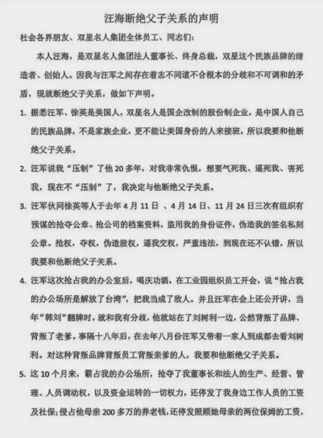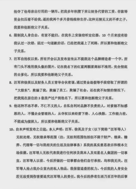 汪海在其中列出整整11条理由,控诉儿子汪军、儿媳徐英多次“逼宫”“抢公章”,将他一步步挤出自己一手打造的企业核心。他用词毫不留情,直指对方“背叛品牌、背叛老爹”。