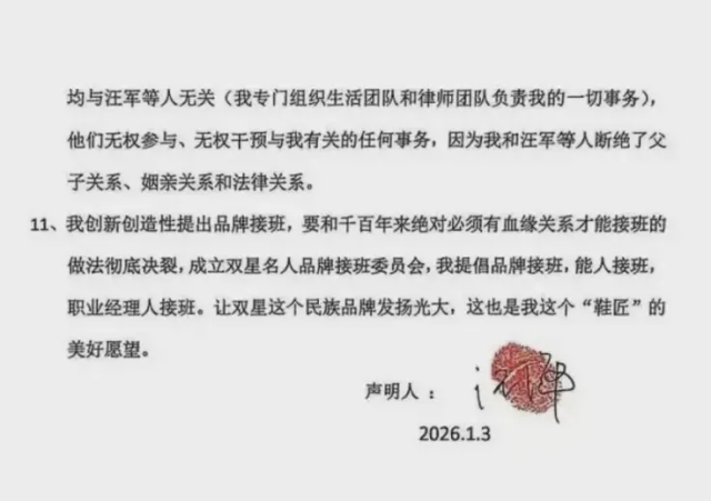 更耐人寻味的是,在声明结尾,汪海不仅与子女“划清界限”,还顺势宣布将打破家族企业“血缘接班”的传统,计划成立“双星名人品牌接班委员会”,由职业经理人或能人接班。这几乎等同于一句话:这个企业,宁可交给外人,也不会再交给自己“美国”儿子。