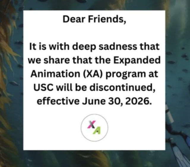 2月20日,USC电影艺术学院投下一枚震撼弹——正式宣布终止“拓展动画:研究与实践”硕士项目(Expanded Animation: Research + Practice,简称XA)。校方给出的理由是“招生人数下降”与“项目不可持续性”。