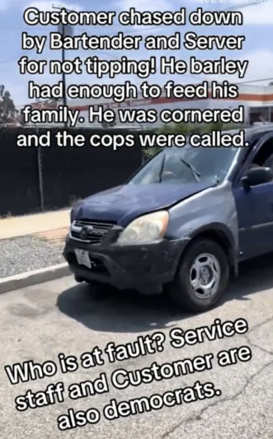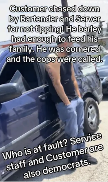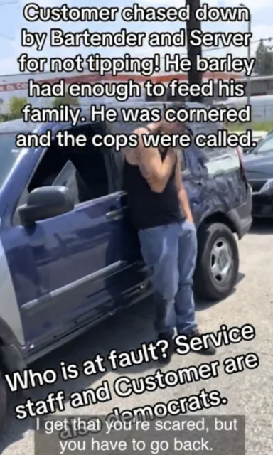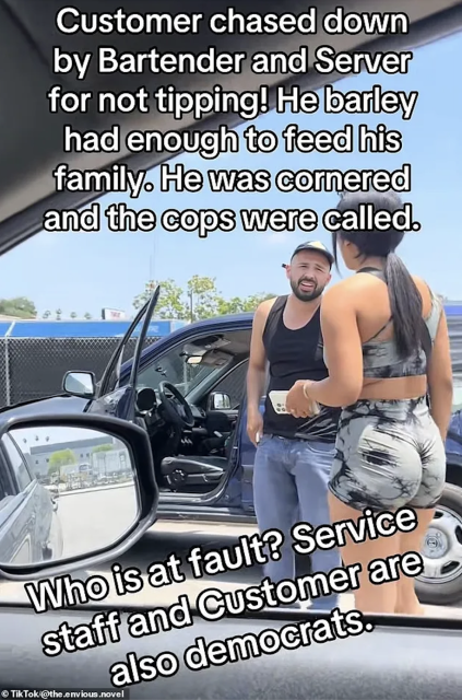 一名男子在餐厅用餐后没有留下小费,刚走出门,就被两名服务员和酒保一路追到停车场。视频中,他们甚至用车挡住男子的去路,要求他“回来补上小费”。