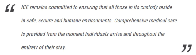 ICE发言人Tricia McLaughlin回应称,“ICE 始终致力于确保所有被羁押人员生活在安全、稳固且人道的环境中。从被羁押人员到达起,直至整个羁押期间,都会提供全面的医疗照护。”