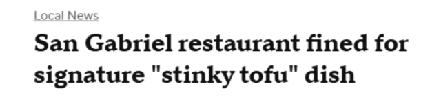 然而,在洛杉矶圣盖博一家台湾菜系的中餐馆,他们家出售的臭豆腐却因气味问题遭邻居投诉,最后被开罚1200美元。老板廖先生(David Liao)指出,这道菜自2014年餐厅开业起便是招牌菜,占餐厅营收约10%至20%,也是文化认同的重要象征。