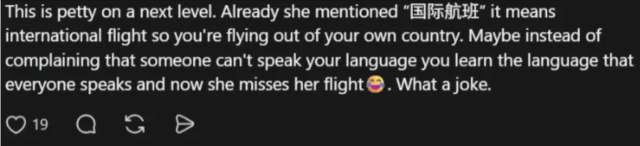 有网友评论:“这是国际航班,用英语沟通很正常。如果她真的是空乘,更应该清楚飞行时的基本规定。”