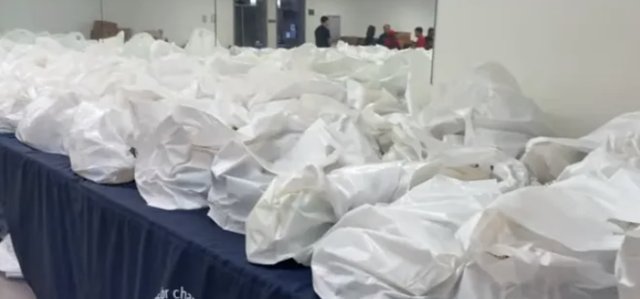 社区中心的大房间摆满了一袋袋装好的食物。几十位志愿者连日忙碌,一直到开领前的晚上仍在打包。