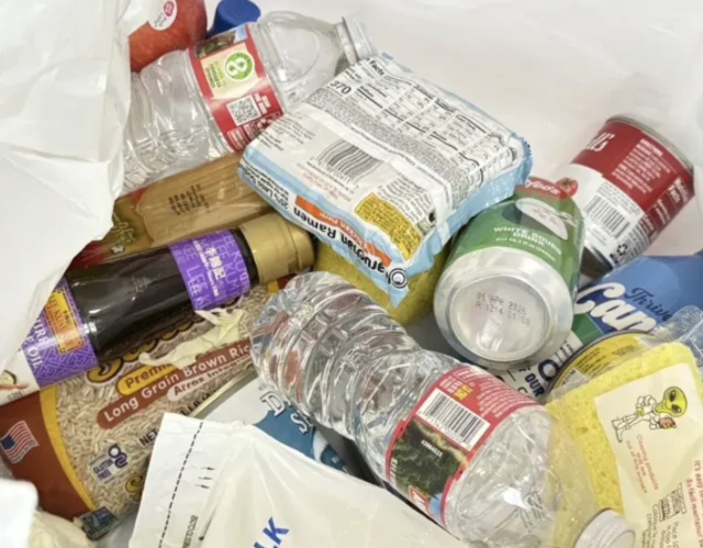 当天十点正式发放,食物袋里有米、面、油、罐头、鸡蛋和水果。洛杉矶连下了一周雨,23日久违的阳光格外温暖。
