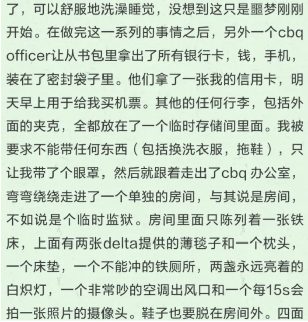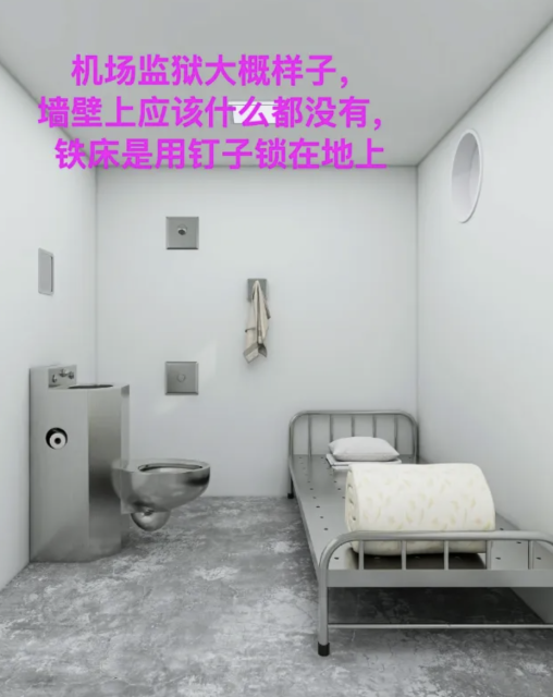 根据其描述,在等待返程期间,他被安置在机场一处临时拘留区域。该区域为封闭空间,内部陈设简单,包括固定床位、金属卫生设施及持续照明装置。他称自己在此停留至次日早晨,被工作人员带往登机口后乘机返回中国。