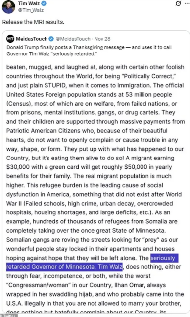 围绕MRI 的争议始于特朗普在感恩节期间,曾在社交媒体上称沃尔兹“seriously retarded(严重智障)”,引发外界热议。