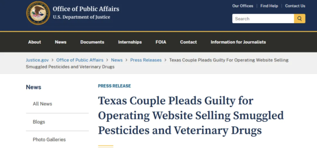 根据美国司法部发布的新闻稿,居住在加兰市(Garland)的杨某(Thao Duong,音译)和麦某(Lam Mai,音译),长期经营一个网站,向全美客户出售从墨西哥走私入境的农药和兽用药品。这些产品不仅未在美国注册,部分甚至被冒用标签、违规销售,存在严重安全隐患。