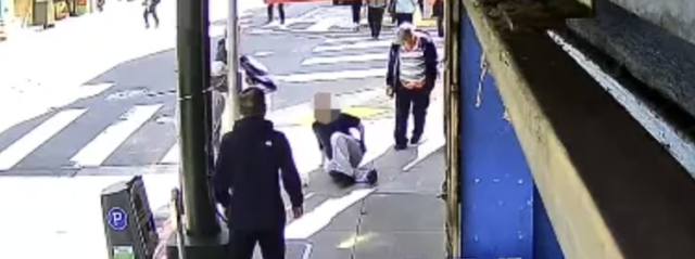 受害者猛地后退,最终倒在地上,而旁观者却从他身边走过,没有伸出援手。