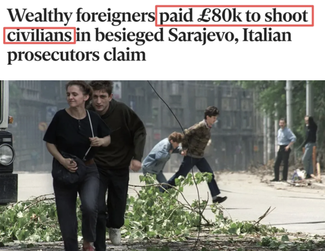 米兰检察机关正式对多名意大利公民展开调查,这些人被指控在1990年代波黑战争期间,支付高达8.8万英镑(约98万人民币)的费用,前往萨拉热窝附近高地狙击平民,只为“感受杀戮快感”!