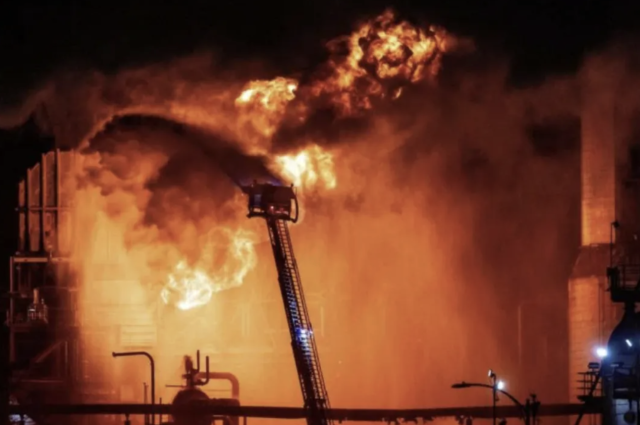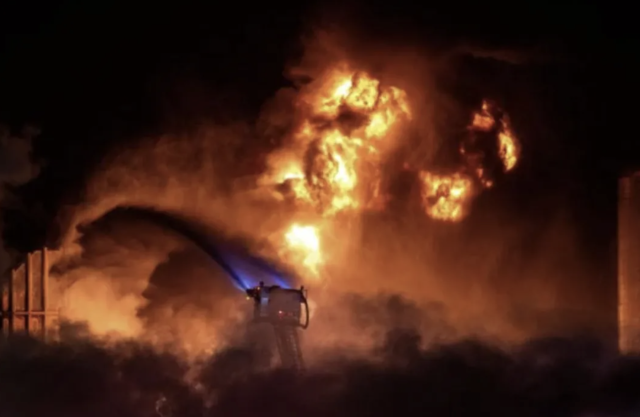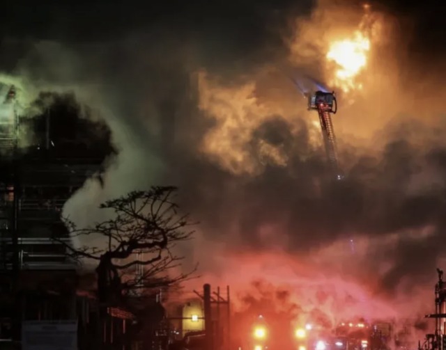 社交媒体平台上PO出来的视频显示,火焰高达数层楼,消防车架起云梯奋力喷水扑救。