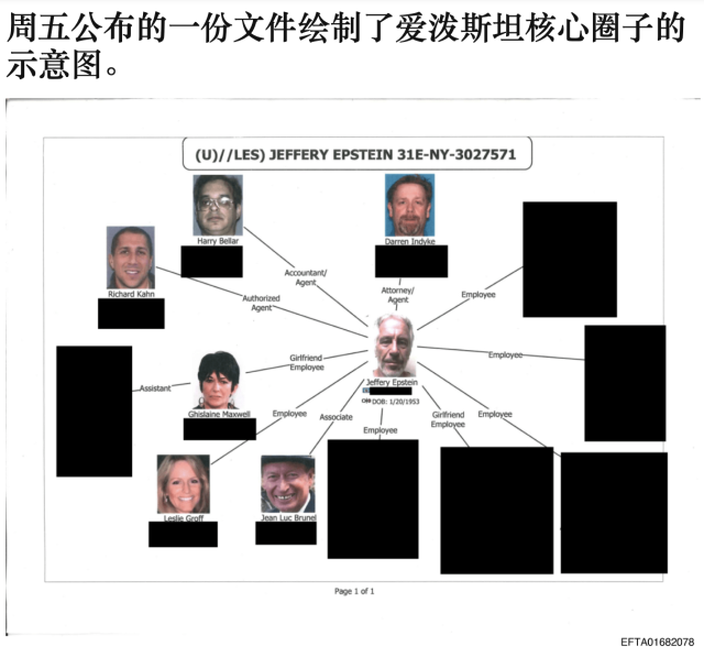 此次档案还公开了一张“爱泼斯坦核心圈”关系图,列出其长期助手、财务顾问、律师、飞行员等人员。其中,只有吉斯兰·麦克斯韦一人被定罪,因协助爱泼斯坦进行未成年人性交易。