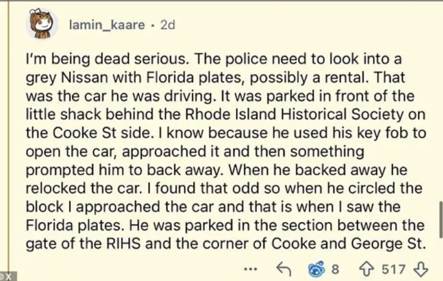 警方公布枪击案“重要线索人物”照片后,John 在社交平台 Reddit 上发帖称自己认出了嫌疑人,并提醒警方注意一辆可能为租赁车辆的灰色日产轿车。
