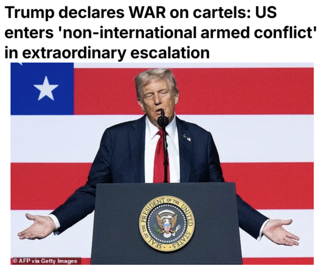 昨天,特朗普向国会发出一份机密备忘录,正式宣布:美国现在已经对贩毒集团宣战,正式进入“非国际武装冲突”状态。