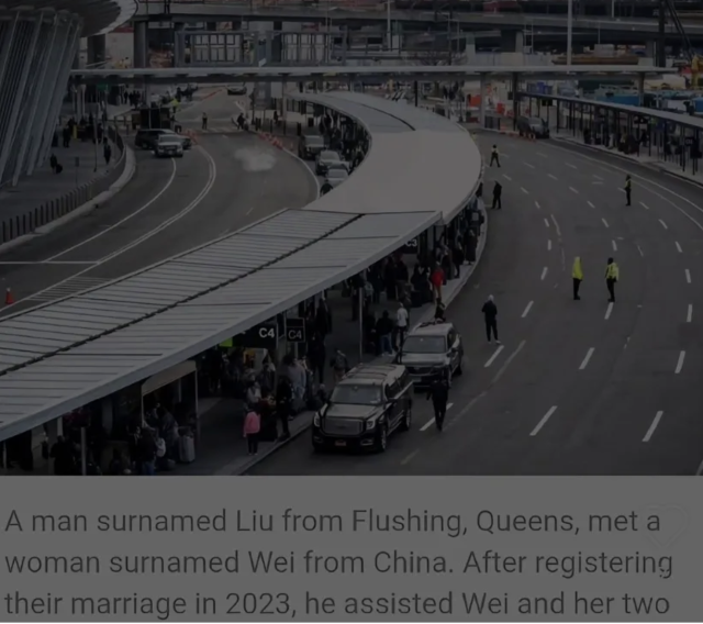 婚后,柳男以美国公民身分为妻子及其两名女儿申请移民。他表示,所有移民文件均由女方在法拉盛经营旅行社的阿姨代为处理,而相关费用由他全数支付,期间以现金与红包方式累计支出约3至4万美元。