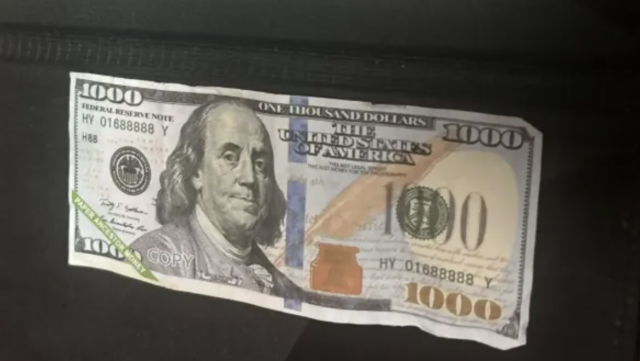 大概是突然察觉不对劲,尽管当时店里比较忙,店员还是多看了一眼那张纸币。突然,她意识到这张钞票是假的——一张新奇的 1,000 美元钞票。