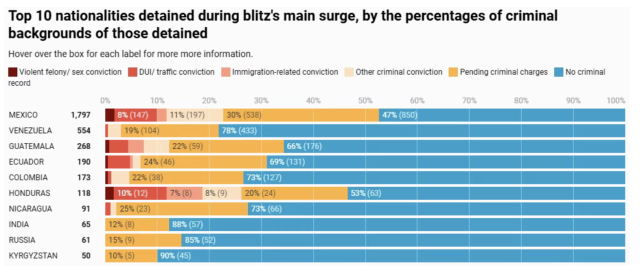 现有数据表明,在行动中被捕的绝大多数人没有已知的犯罪记录。虽然公布的数据不包含被拘留者的姓名,但每当有人被登记入库时,ICE 都会对该人的犯罪史进行分类。《论坛报》分析发现:在所有被拘留者中,60% 的人没有犯罪史。