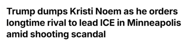 在明尼苏达州接连发生致命枪击与大规模抗议之际,美国总统特朗普突然出手,将国土安全部长克里斯蒂·诺姆(Kristi Noem)边缘化,并下令由其长期对手、强硬派移民执法人物汤姆·霍曼(Tom Homan)直接接管当地的移民及海关执法局(ICE)行动。